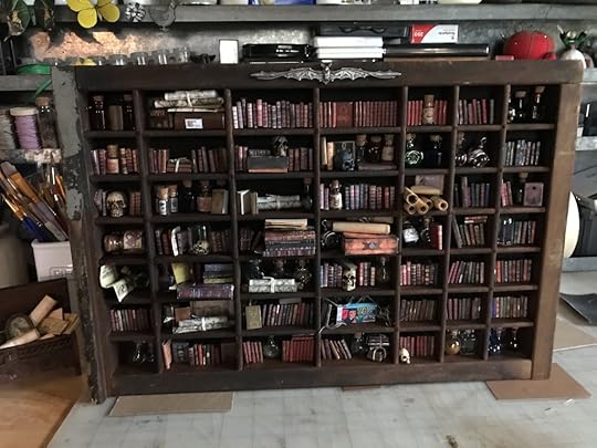 Love this photo showing all the books (that open and are printed), scrolls, lights, and bookcase made from an old typesetting drawer (cut into 3 sections).