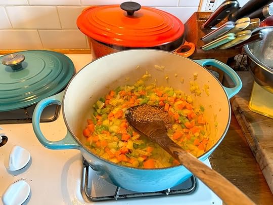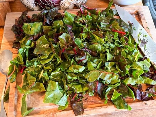 But that’s so unnecessary. Just chop your veg at the beginning and it’ll still taste good at the end. I didn’t have carrots for this particular presentation, but I did have Swiss chard from the farmer’s market, so I chopped the stems along with celery and onions and a lot of garlic (not pictured). Eventually I added the beans and water (plus salt) and when the beans were about 9/10ths of the way there, I added the leaves all chopped up.