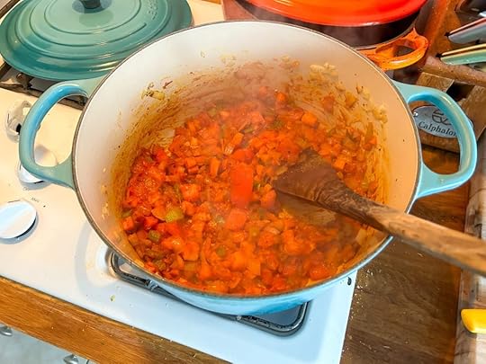 This recipe, I should mention, comes from The Mediterranean Dish by Suzy Karadsheh. It’s a great book because the recipes are approachable but also exciting. Like this one: you basically cook a bunch of vegetables in olive oil, add spices, then your tomatoes and tomato paste.