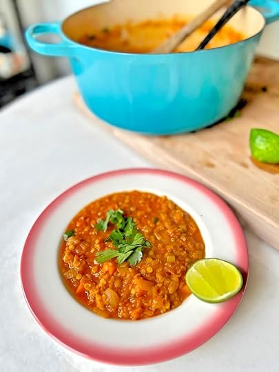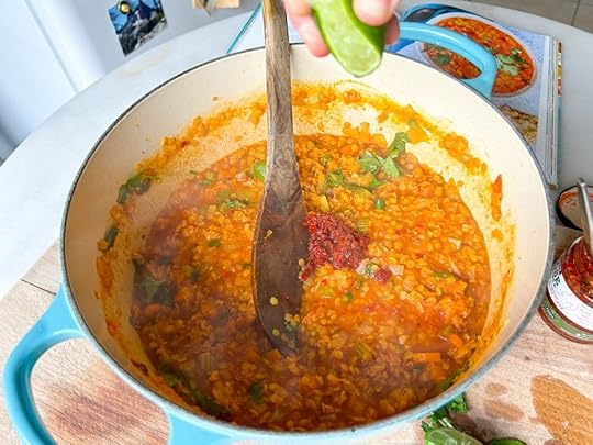 So the next time you look out your window and see wet stuff, make red lentil soup with harissa. This is as seasonal as it gets.