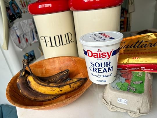 The rest of the ingredients you already have around the house, assuming you keep bananas around the house. (I do and I let them get really, really black before baking with them.) Then there’s the cocoa powder (I like Valrhona), flour, baking soda, salt, vegetable oil, sugar, vanilla, an egg, the sour cream, and the banana. Oh and did I mention the chocolate chips? Yeah, there’s chocolate chips in there too.