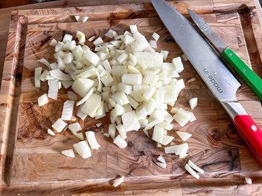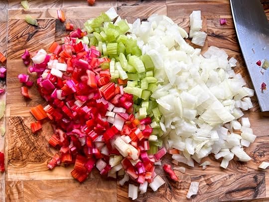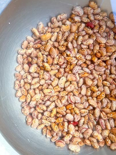 I used to be weird about my beans. I’m not sure whose recipe I read or where I got it from, but my old method was to cook dried beans with a whole onion, a whole carrot, and a whole piece of celery for two hours or so until the beans were cooked through, then I would drain them — saving some of the cooking liquid — and saute a bunch of chopped onions, celery, and carrots in a different pan. I’d add the beans to that, with the liquid, and I guess it freshened things up to have those new chopped vegetables instead of the old soggy ones?