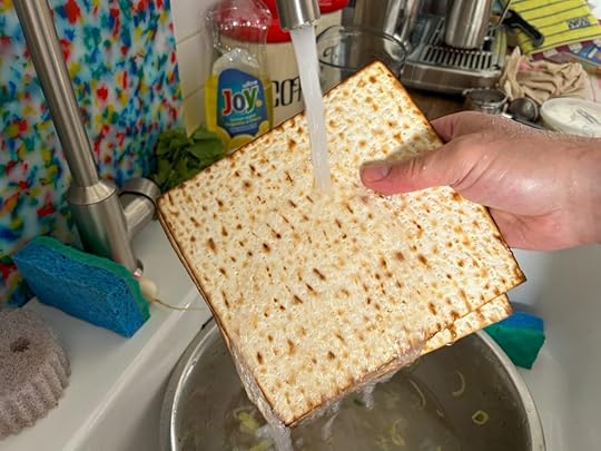 If matzo brei sounds complex, worry not! It’s as simple as this: you wet some matzo under a faucet, to get it slightly moist so it melds better with the eggs. Then you break it into 1/2-inch to 1-inch pieces directly into the skillet with the onions.