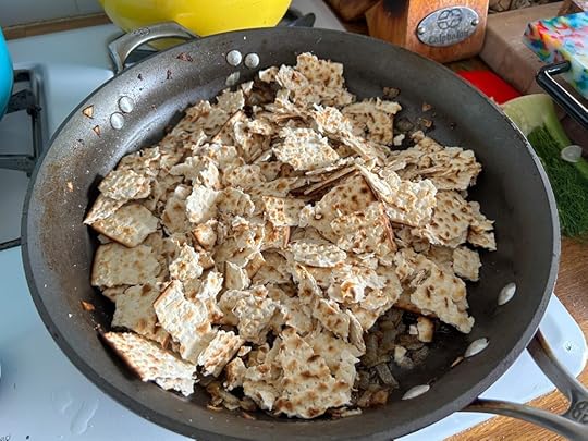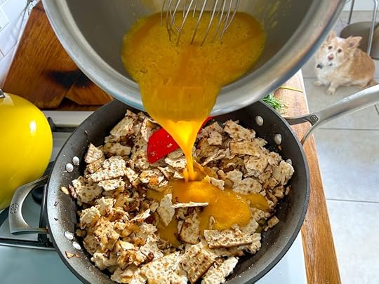 Some add the eggs and the matzo at the same time, but I enjoy this opportunity to meld the matzo with the onions and to get a little color on it with high heat. Also: if your matzo is unseasoned, it’s a good idea to season it here.