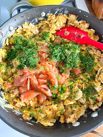 I actually got the idea to make matzo brei watching America’s Test Kitchen where they revealed their ratio: for three eggs, it’s two sheets of matzo. Because we were having company over when I made this, I upped the number of eggs to eight and the sheets of matzo to five. How’s that for SAT math? Maybe it’s not 100% accurate, but it worked. And once the eggs set up and all of the matzo was coated, I stirred in the smoked salmon (I couldn’t find lox at the farmer’s market) plus lots of chopped chives and dill.