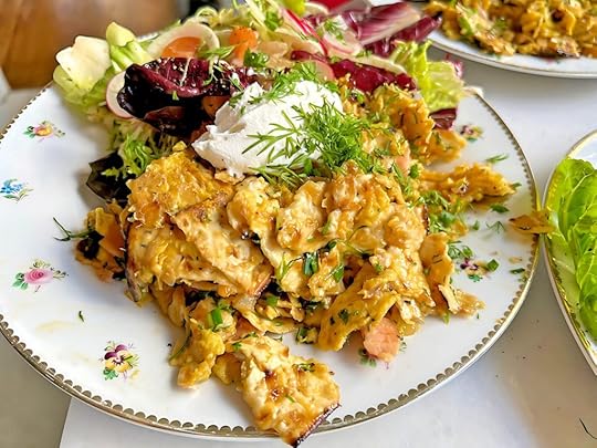 To plate, I made a quick salad with winter lettuces (radicchio, endive, frissé), Cara Cara oranges, radishes, and fennel and served that alongside the matzo brei which I topped with labneh (sour cream or créme fraiche would work too) and more herbs.
