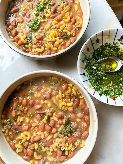 PrintBorlotti Bean Soup with Swiss ChardA light but substantial soup featuring borlotti beans, Swiss chard, and a quick herb salsa.Course SoupCuisine ItalianKeyword beans, Borlotti, soup, Swiss chardPrep Time 30 minutesCook Time 2 hours 30 minutesIngredientsFor the soup:1 pound dried borlotti beans1/4 cup Extra-virgin olive oil1 yellow onion, chopped2 stalks celery, chopped2 carrots, chopped I didn't have carrots, but if you do, it'll add more depth of flavor1 bunch Swiss chard, leaves and stems separated, stems sliced thinly, leaves choppedKosher salt6 cloves garlic, thinly sliced1 pinch red pepper flakes1 Parmesan rind (optional) Brings extra umami to the soup2 Bay leaves (optional)1/2 pound elbow macaroniFor the herb salsa and for serving:1 bunch flat-leaf, Italian parsley2 cloves garlic, peeled1 lemon zested and juiced1/4 cup extra-virgin olive oilAged Parmesan cheeseInstructionsIf you're a person who soaks your beans, soak your beans in plenty of cold water the night before you plan to make this soup. If you're not a soaker, skip it! Just cook the beans longer.Pour the olive oil into the bottom of a Dutch Oven. Heat it on medium-high heat and when it's hot, add the onions, celery, carrots, and Swiss chard stems with a pinch of salt. Saute for five minutes or just until the vegetables are soft, but not brown. Add the garlic and stir together, cooking another minute. Add a pinch of red pepper flakes — more if you like it spicy.Strain the beans and pour them into the pot with the vegetables. Add eight cups of water and bring to a boil. Season the water with a tablespoon or two of salt… you don't want to over-season it here, because the liquid will reduce and it might get too salty. But under-season, and your beans might be bland. So try to strike a balance. Add the Parmesan rind and the bay leaves, lower to an active simmer.Cook the beans for an hour — adding more water if the soup becomes too thick — and start to study them. Are the skins starting to come off? Do they smush easily against the side of the pot? Taste here. You're looking for incredibly soft and creamy. You don't want al dente beans, this isn't pasta. Also taste for seasoning here — if the liquid is bland and the beans are bland, add more salt. When the beans seem to be close to done, stir in the Swiss chard leaves, another pinch of salt, and cook for another thirty minutes. Remove the bay leaves and the Parmesan rind and add the pasta. Cook just until done.To finish, make your herb salsa. On a cutting board, cut the leaves off the parsley the best you can (but a few tender stems are totally fine) and lay the garlic on top of them. Chop the garlic and parsley together for a while until all you have are green and white flecks. Lift them into a bowl, stir in the lemon zest, the lemon juice, and finally the olive oil. You might want to use more oil if you have a lot of bowls of soup to doctor.To serve, ladle the soup into bowls, drizzle on the herb salsa, and grate some Parmesan cheese on top. The post Borlotti Bean Soup with Swiss Chard appeared first on The Amateur Gourmet.