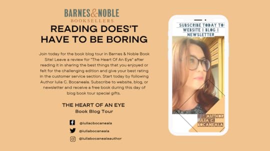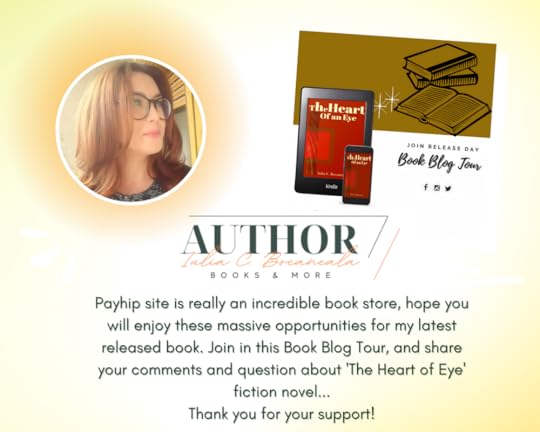 The ebook goes out to 1.9 $ from a usual price of $3.5 ,HERE , You’ll get 60% Off over for this day all the way up to 70% to 80% off all day.The Kobo site requests that you leave a review after purchasing the book on this site to help the author and support the book's performance. You also can subscribe to Author Iulia C. Bocaneala contact list to get a free copy during this day, adding the name of this shop, for a giveaway session made during this book tour date. Follow today THE HEART OF AN EYE Book Blog Tour also to some gifts offered to some of the readers that take part in this book tour day.