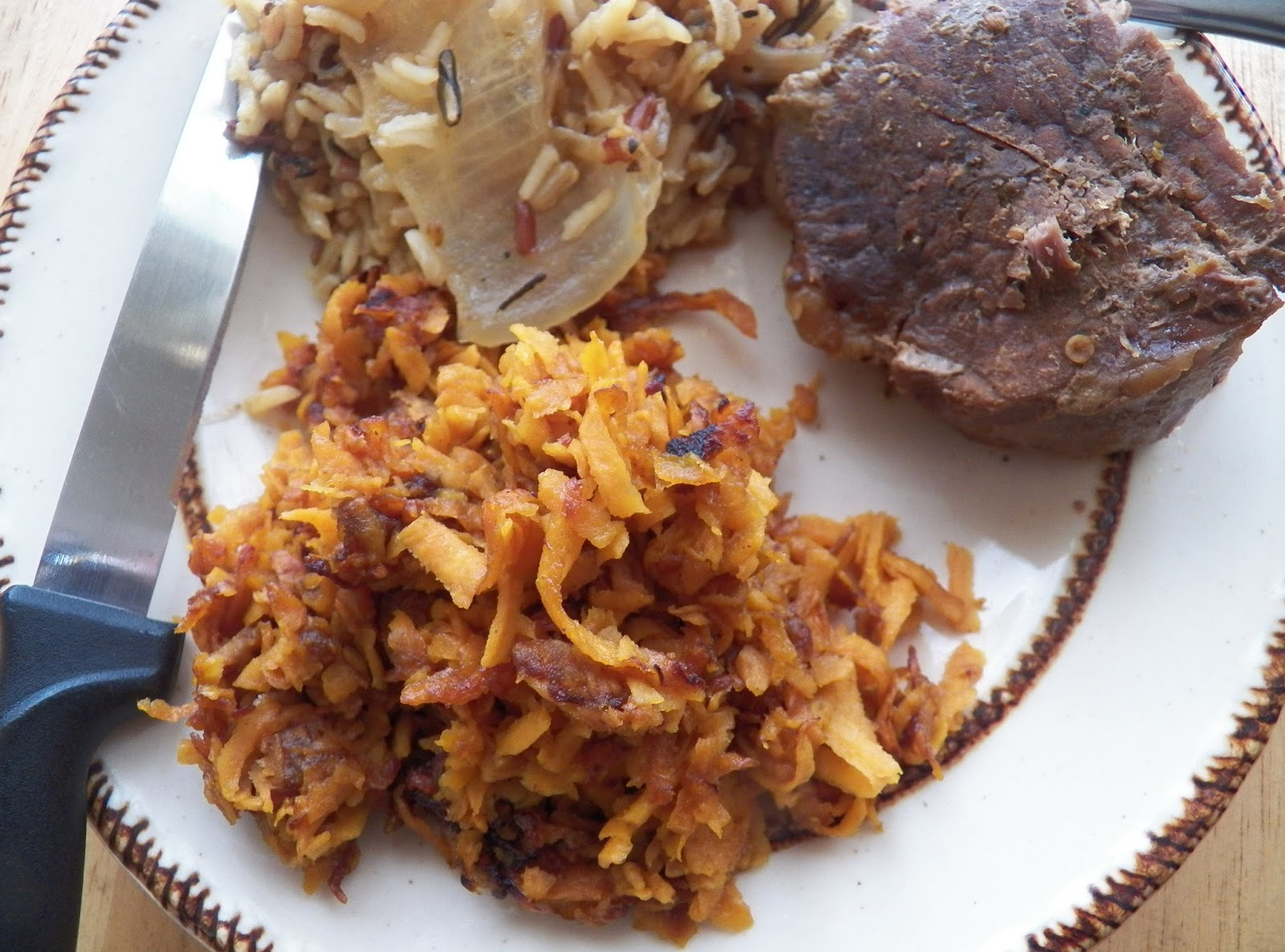 Comment: When I was a kid my Mom would make fried sweet potatoes. She would cut them into strips and fry them in butter allowing some to brown. When they were done she would sprinkle them with sugar instead of salt. This was a delicious dessert for us. I decided to try grating my potatoes and see if I could get the same taste without all the butter that was required when she fried hers. This worked perfectly! I could eat these every day! If you don't like cloves you can sprinkle a little nutmeg or cinnamon or nothing at all.