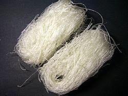 Cellophane noodles - hard, clear white noodles made from mung beans: turns translucent when cooked in liquid, puffy and crisp when deep fat fried - used in Oriental style dishes