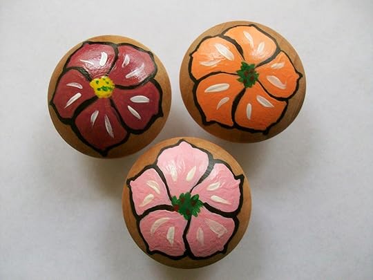 I decided to change that and put some structure back into my life. I've made a list of things that I want to do. Due to my back I'm limited as to how much I can do at one time but at least I can do a little every day. I started in my kitchen where I spend so much time. I looked at my cabinets and came up with an idea to change them. I like their color - yellow - but wanted to change the handles. I looked online, in Lowes, Home Depot, etc. and found some handles I like but they are almost $4.00 each plus shipping and since I need 24 handles that will climb up there a bit in dollars. Then it hit me. You have time, make your own. I wanted flowers for my handles so I went to Wally World, found some wooden round handles, printed out a simple flower pattern that fits the handle perfectly, traced it onto the wooden handle and am in the process of painting my own.