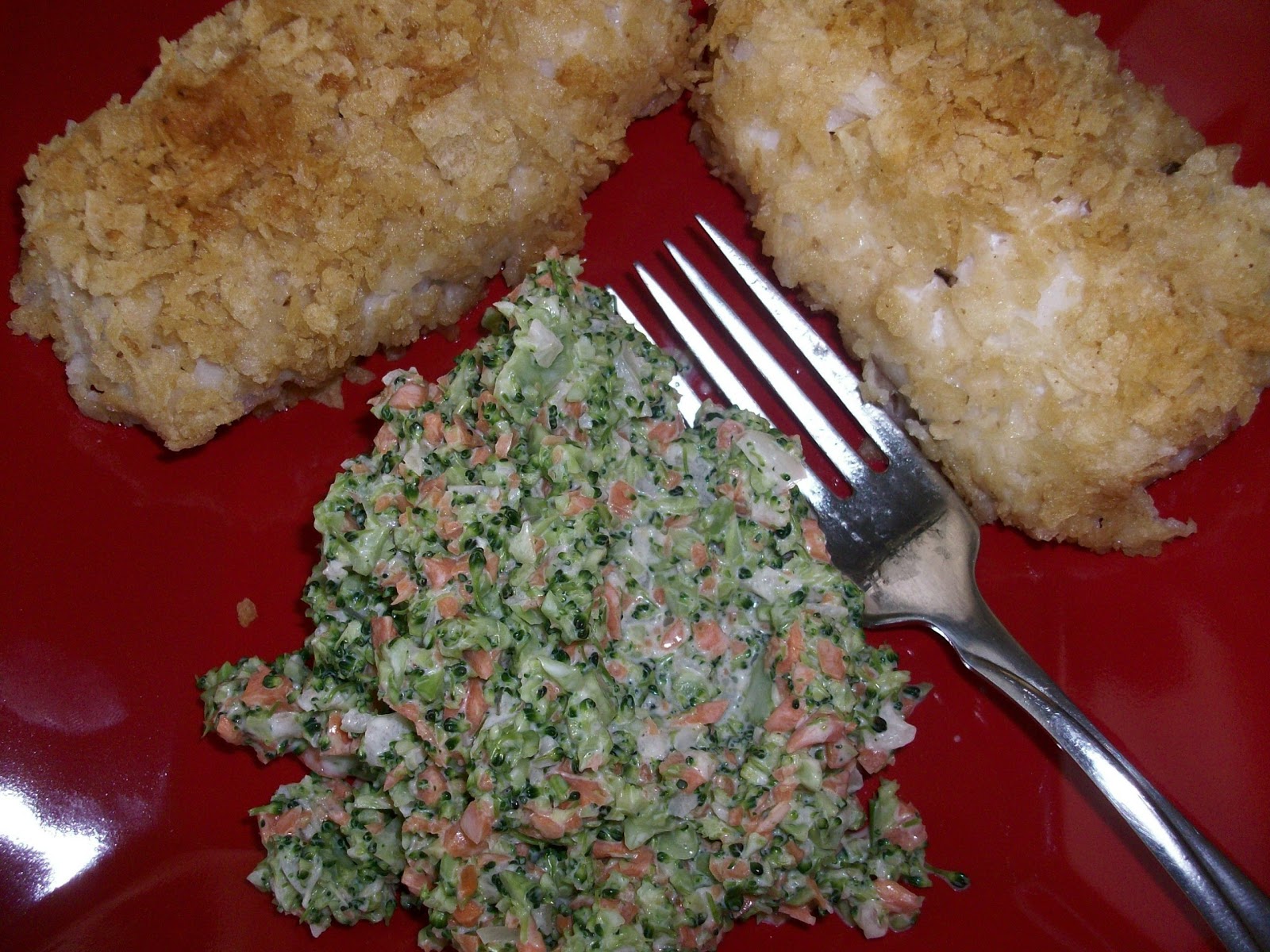 In a food processor chop finely broccoli, carrot and onion. Add mayo and equal parts of sugar and vinegar to taste. I used 1 large broccoli head/crown, no stalk, 1 large carrot and 1/2 med. onion. The mayo, sugar and vinegar are added to suite your own taste. I ended up with enough slaw for 4. This has to be one of the best slaws I've had in a long time. I came up with this while wanting slaw to go with my fish but found I was out of cabbage and it was a real hit. It's also good on hot dogs.