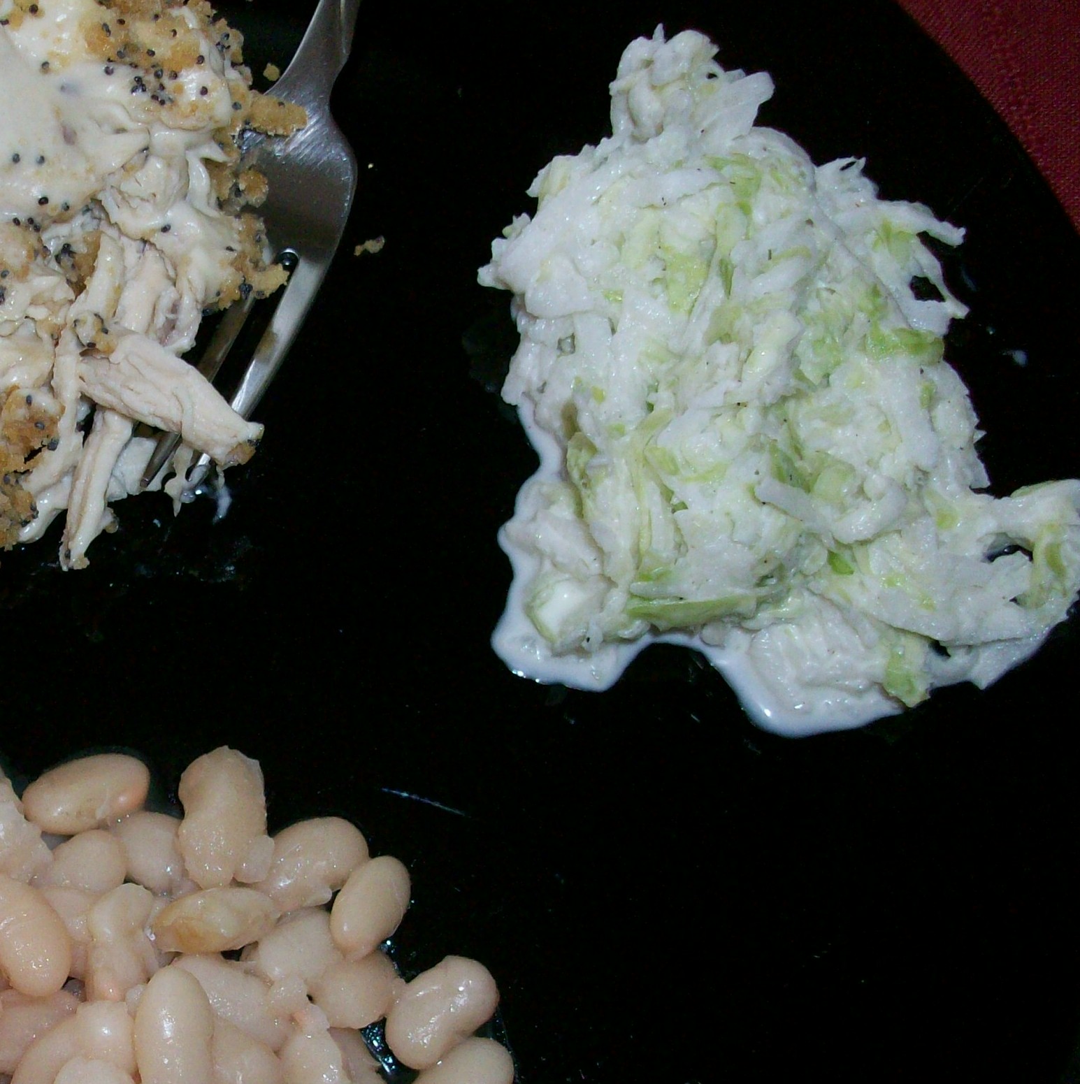I made the slaw using shredded turnips instead of cabbage. I did realize that the color was all white so I shredded just enough cabbage to add a few specks of green. Both of my guests raved about the slaw! After dinner I told both they had just eaten 'Turnip Slaw.' Neither could believe it.