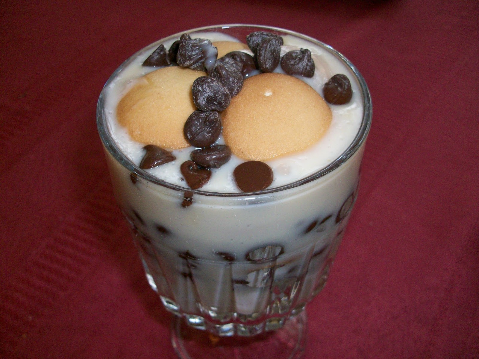 I better hope my daughters don't read this post. I always make Banana Puddin for the holidays but this year I didn't. I want one of my daughters to learn and had hoped they would attempt to continue this tradition. They didn't and therefore were a bit upset because there was no Banana Puddin for Christmas Dinner. I've told them that they will have to make it from now on. Well, a friend requested some so I made a big bowl today. I normally have the perfect amount of pudding and none leftover but for some reason I made too much this time. What to do with it? I got creative and came up with a Chocolate Chip Puddin. This is so easy to make. It can be worked up in individual dishes for a really attractive dessert or made in a large bowl. I personally like the individual dish best.