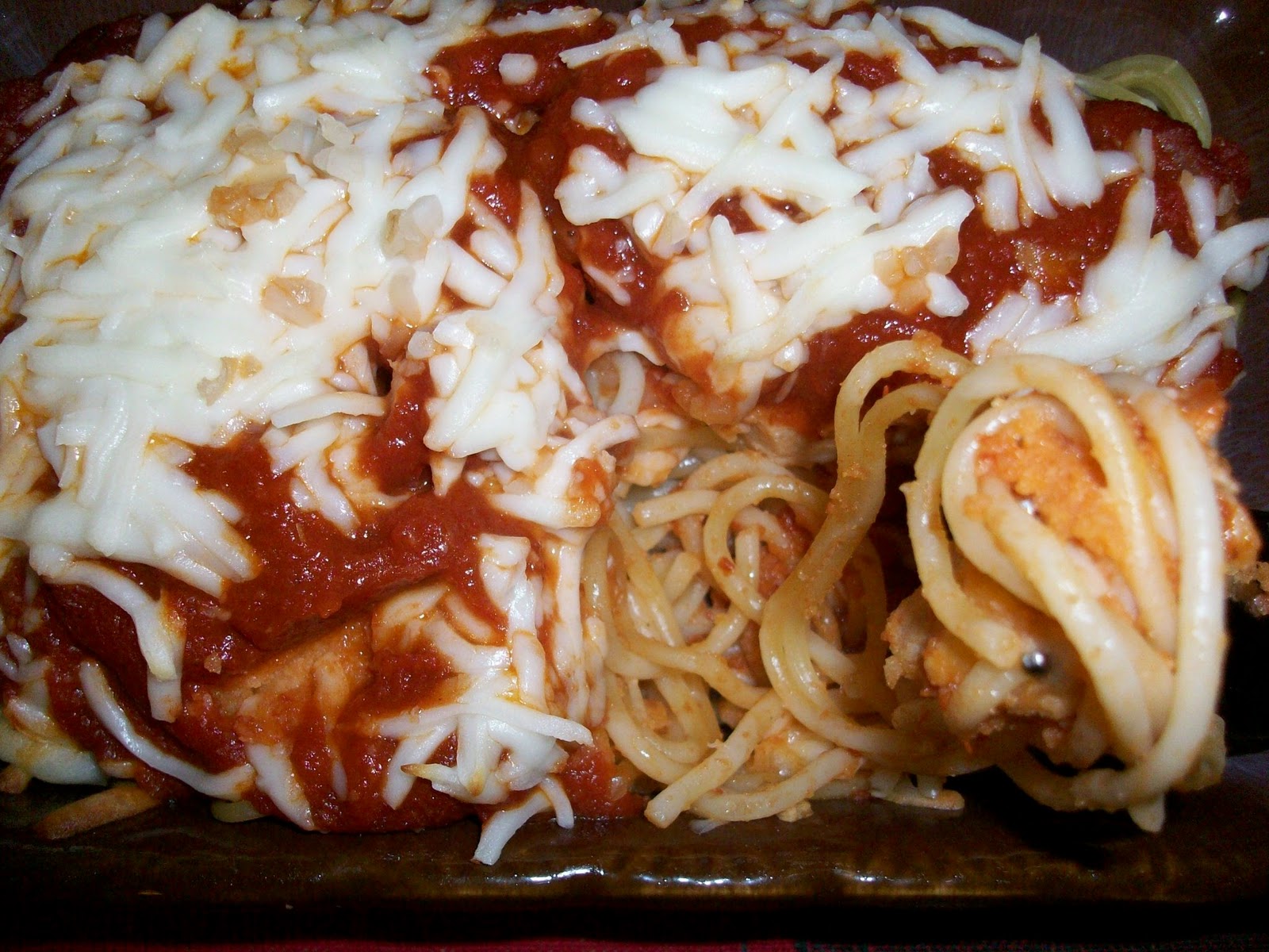 Place 1 pre-cooked, breaded chicken breasts over top of spaghetti.