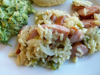 This dish is made using Kielbasa and Rice Pilaf. Its colorful but you can add even more color by using red and/or yellow peppers. If you don't like Rice Pilaf, use plain rice, wild rice, brown rice or a combination of both. If you don't like Kielbasa, use chicken. See the full recipe by going to Martha's Recipe Cabinet