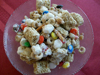 This is another of my "clean out the cabinet" snacks. I used shredded wheat, honey flavored cherrios, pretzels, left over M&Ms, mini-marshmallows, about 3/4 can of salted mixed nuts and I cut up about 1/2 bag of toasted coconut covered marshmallows. I put all of this into a LARGE bowl, drizzled melted white chocolate over everything, tossed to coat. So good!And I feel it is actually healthy due to the shredded wheat and cherrios. Right?