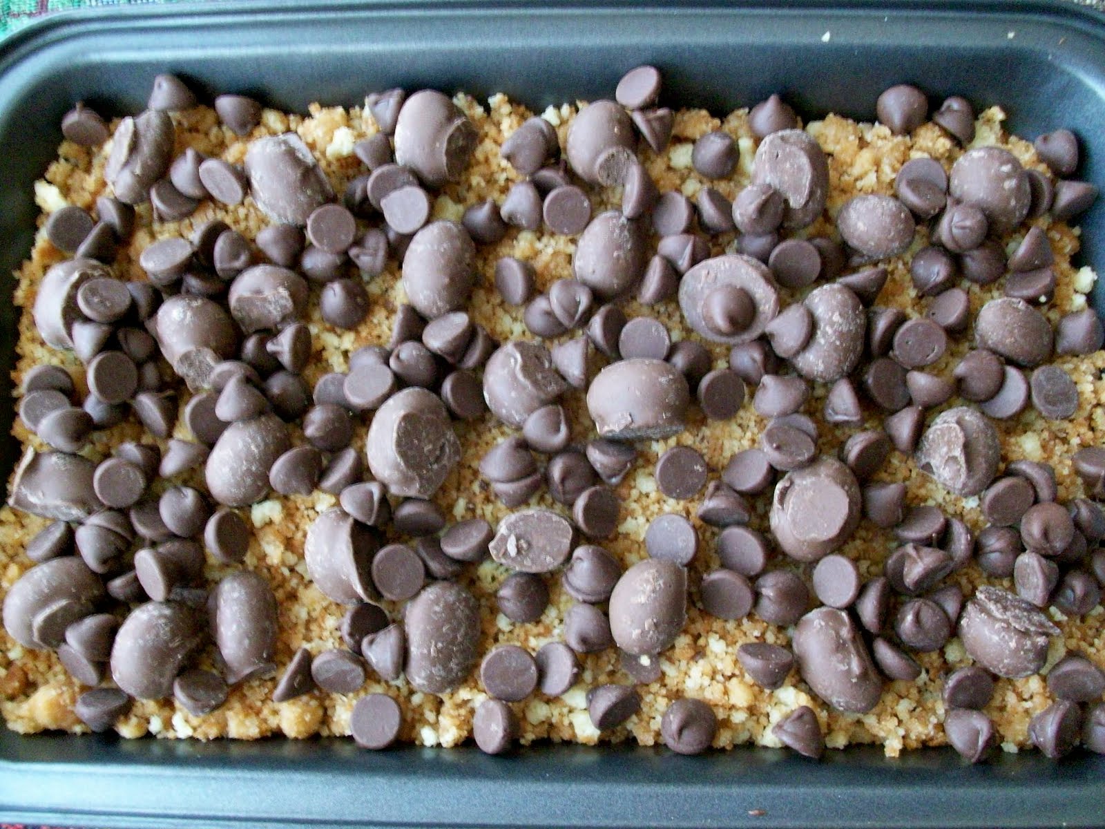 This one came to me while walking through a variety store of all places. The store has a food section and I spotted marshmallows and decided to come up with a new recipe using them. So here is what I did.I used (1) 1 lb. pkg of coconut cookies, these I placed in a plastic bag and pounded them until they were crumbs. I melted 1 stick of butter and mixed it in with the cookie crumbs. I pressed the crumbs into the bottom of (2) 9 x 13 baking dishes (I planned on taking them to a cookout so I needed a lot). I had (2) 7oz. bags of chocolate covered peanuts and sprinkled them over my cookie crumbs. Then I sprinkled everything with chocolate chips (picture on left). And topped everything with mini-marshmallows. The only thing left was to bake in a 350 degree oven until the marshmallows melted and browned. The picture on the right is the finished product. I think most of you know that I don't like chocolate but even I liked these.