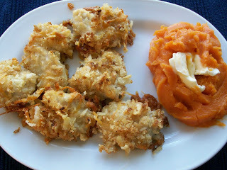 I found a recipe for chicken crusted with cheese crackers and couldn't wait to give it a try. It turned out that I was out of cheese crackers so I did my usual - I decided to Think With My Taste Buds and came up with this recipe. This does have cheese in the crust so changes can be in the cheese flavor. Pepper Jack would be wonderful and give it a touch of heat or you can increase the amount of onions and add more flavor.