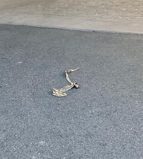 I couldn’t be this lucky, I think to myself. What are the odds of finding a rattlesnake skin that’s been sluffed off, left behind in one piece, and in pretty good condition? But there it is, of all places on the driveway of the Fairfield Inn, in Laramie, Wyoming. I figure, Well yeah, I’m out west. This is Laramie. It’s where rattlesnakes live. And cattle rustlers and sherrifs and matronly good-hearted bar maids and well-dressed hanging judges.