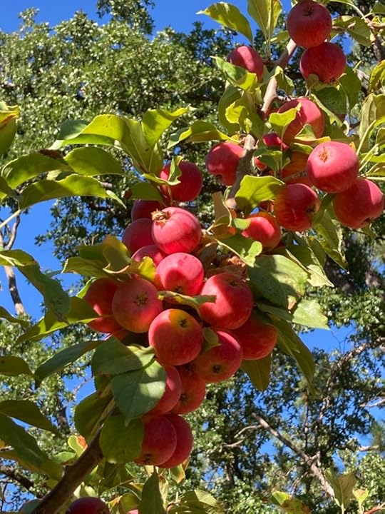 Yesterday Tizi and I picked Kerr apples. These beauties hang on eight trees in the row closest to our kids’ house. The Kerr apple is in the crabapple family, about 1” to 1 ½ inch in diameter. They are tart and sweet at the same time, and they are gorgeous to behold. As they ripen, they become dark red; given sun and time, that color deepens to a ravishing burgundy, bordering on purple.