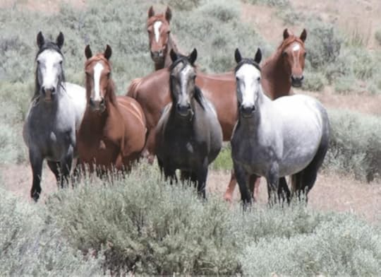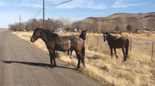 It’s a little tense at the moment. We could be counting wild horses. When we drive out to California to visit our son, we take this desert route on purpose, to see the horses, starting 70 miles west of Elko, Nevada, on I-80 to Battle Mountain, so named thanks to a skirmish between marauding Californians and native tribes in 1850. A few miles east of Battle Mountain you see the giant BM on the mountain side. The Californians prevailed. Heading south on route 305 we come to route 50, along which on Bureau of Land Management land, roughly 2000 horses run wild.