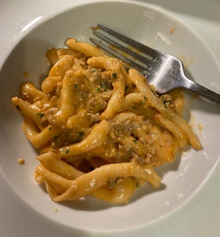On the menu are strozzopreti picchio pacchio. Later, when I check on the origins of that term, I learn picchio pacchio is a Sicilian dish, possibly a version of the sicilian pic pac (single syllables), reminding me of Tizi’s mother, who would refer to her speedy seering of a piece of meat in a pan for the kids as tric e trac (single syllables).