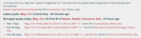 The site I consult for earthquake info over here is called Raspberry Shake. I appreciate the humor. The name calms the nerves, if only slightly. Here’s the news: “In the past 24 hours Italy had one quake of magnitude 2.6. There were also 55 quakes below magnitude 2.0, which people don’t normally feel.” Fifty-six earthquakes. In 24 hours.