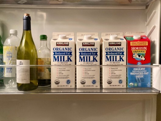 If you looked in our fridge, you’d think that we have a habit, that one or both of us is a milk-aholic. That we should seek help. My son-in-law looked in there once, after I had just come home from Costco, and said Wow, who drinks all that milk? Well, I do. Drinking it takes a while. Ultra pasteurized milk today will last up to a month in the fridge. Confession: it’s gone before a month is up.