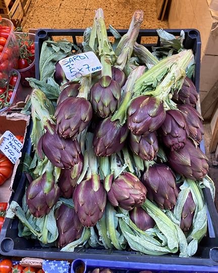 We wandered around our favorite blocks near the cathedral, I’d call it the glutton district, and got to Teresina a little after 1:00. We may tell ourselves we’ll skip the pasta. We might even believe it when we tell ourselves that. But when the server said, First? meaning first course, primo piatto? He said, First? and we’re in Bologna, so we said, Why yes, bring us what’s off menu today. It was tagliatelle with a veal ragu. We got one plate and sort of shared it. Other stuff came after that. Tizi heard the word carciofi (artichoke). We’d seen heaps of them out there in front of the fruit markets. I asked the server, Artichokes today? He said, Salad. I didn’t ask for it, but he brought it. And I ate the artichoke salad, thinking, Roughage. I’m taking on roughage. That’s good.