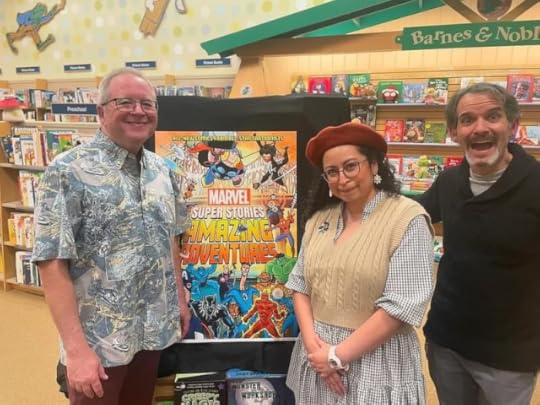 Me, Amber and Judd with our book cover (disclaimer: the actual book is not that large).I had a terrific time talking about Marvel Super Stories: Amazing Adventures with Judd Winick and Amber Padilla at the Barnes & Noble in Emeryville, Calif. Tuesday night. We were three of the 15 cartoonists who contributed stories to the anthology, and just hanging with them was great! The fact that there was an audience there to watch us talk was even better.
