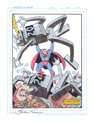I'm working on the commissions I got through the Cartoon Art Museum's "Sketch-a-Thon at Home" Comic-Con fundraiser. This request was for the Mechanical Monster, one of the robots Superman fought in his 1941 cartoon and also the star of my most recent graphic novel. This requester paid a premium price, which implies some extra characters and color, so I hope they don't mind that I threw in Superman.