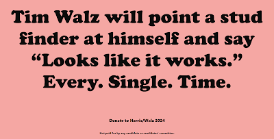I'm really enjoying the ton of Tim Walz memes zipping around. America's Foster Dad. This is my favorite so far, although I'm peeved that Walz stole the stud-finder move that I, personally, invented.