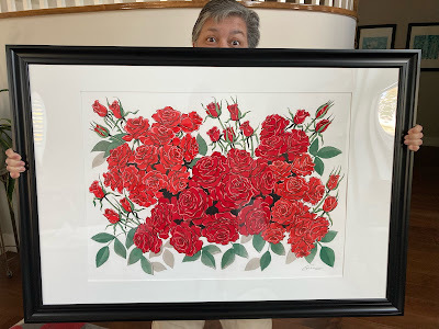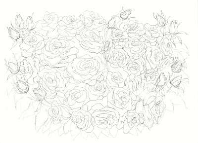 I thought I'd do roses since they come in red and our living room window looks out onto our rose garden. I've spent some time doing studies to try out a variety of styles, compositions, colors, etc. The thing about studies is that they're not meant to be finished pieces. Rather, they're a way of testing different ideas to see which ones work. Risk is the point. Some earlier studies were failures but I think this one is heading in the right direction.