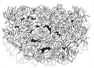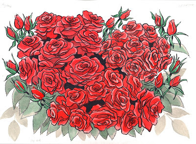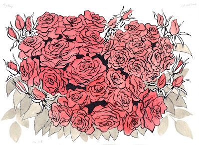 For this piece, I outlined the roses with a loosely brushed ink line. I wanted it to look like something within my stylistic wheelhouse without being outright cartoony, and also be graphically bold rather than photorealistic (which I'm not sure I could pull off anyway). It's not obvious in the scan, but the roses are painted in three subtly different shades of red.