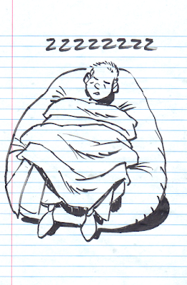 A couple of wags have asked if I'll be making a comic about it. This drawing is my reply. It would be 200 pages of me sleeping in my beanbag chair, interspersed with episodes of eating, showering, and tippy-tapping on the computer, like I'm doing now. Riveting literature.