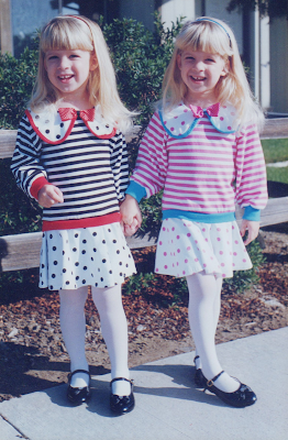 The girls were about 3½ in this photo, which is remarkable because we very rarely dressed them in matching outfits except to make older relatives happy. In fact, this might have been around Christmastime, and I'll bet their grandmother had something to do with it.