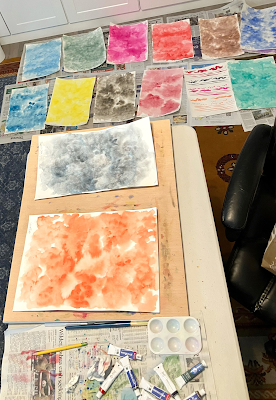 Watercolored pages scattered all over my work table and floor.Starting 2024 with Process! I'm painting a library of watercolor textures to use in my comics. They're abstract blobs in a riot of colors that I can digitally insert into my art to (I think) give it some uniqueness and pop. I did a bit of this on Last Mechanical Monster and A Fire Story, and plan to do a lot more.
