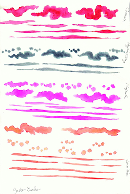 "Smoke and Clouds." Keep in mind that I can make these shapes transparent so that any color under them shows through, so a red cloud on a yellow sky turns orange. If I wanted to, I could even change them to different colors, although I'd probably rather paint new blobs in the color I wanted.Why not just do it ALL digitally? Photoshop has a lot of "watercolor" "brushes" that can fake it pretty well. Well . . . I don't want to. So there. I find myself increasingly drawn to *authenticity* in comics and art. I want to see the imperfect hand of a creator, not the perfect pixels of a machine. Nobody else could duplicate my abstract blobs. Even if I cheat by marrying them with the art digitally, they're still all from my hand.