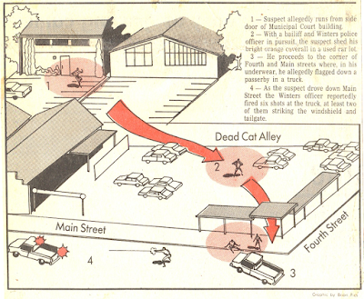 An illustration I did when I was a newspaper reporter. This isn't my best artwork, even for the time, but I did it very fast on deadline so I'm inordinately proud of it. Graphic journalism. And yes, there is a street in Woodland, Calif. called "Dead Cat Alley."Spent my 20s and 30s submitting comic strips to syndicates. Caught the eye of King Features editor Jay Kennedy, who worked with me for more than a year to see if one of my strips was worth signing. It wasn't.