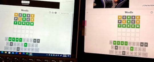 (Delayed a day to not spoil yesterday's puzzle.) Karen and I both play Wordle first thing in the morning. She gets up earlier and does it first. After I do it, we compare notes. Neither of us has a go-to start word, we try to use a different one every day.