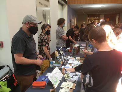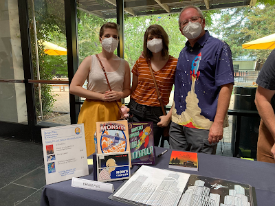 My daughters Laura and Robin came by with Karen, who took many of these pictures, to support their old man. A local bookstore had copies of A Fire Story to sell so I didn't offer that book, but sold some copies of Mom's Cancer and Whatever Happened to the World of Tomorrow? When I can, I like to bring pages of original art so I can talk shop with people interested in how comics are made. A lot of people really like seeing how a drawing on paper gets turned into a page in a book, and I love talking about it!