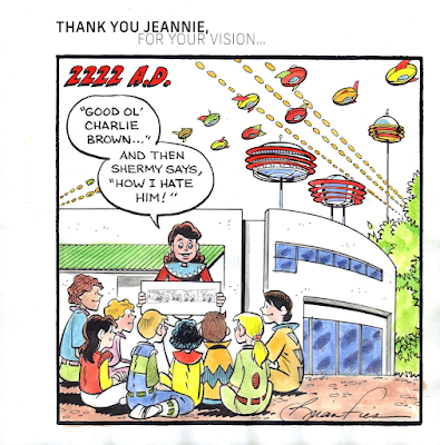 ....and this is that drawing. I thought to myself, "Why does someone start a museum? What do they hope to achieve?" I think the answer is: They want it to continue long after they're gone. So I imagined a time two centuries from now, when our descendants are living in their Jetsons future and kids will still gather at the museum to read the first "Peanuts" comic strip.