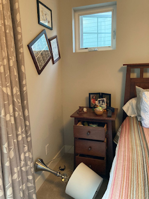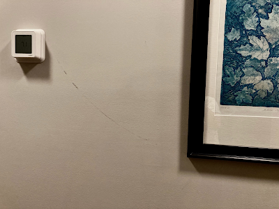 Straightening pictures, we found a scuff mark on the wall showing that one of them swung surprisingly violently. How it stayed on the wall at all we'll never know.