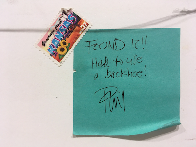 My favorite part is a sticky note on the back of the frame, in Frank's hand, reading "Found it!! Had to use a backhoe!" and affixed with a 37-cent postage stamp. I imagine that Frank dug up and sent the strip to a friend who'd asked for it, with the stamp's "Kansas" theme cleverly echoing the strip. It's also darned good provenance.