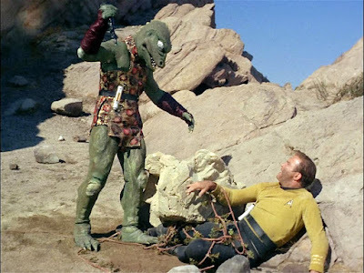 Note the carefully observed details, including the Enterprise in orbit overhead, the Gorn's handmade weapons, and Kirk's bamboo cannon, diamond projectiles, and chemicals he found to make gunpowder. Also enjoy the scenic and iconic Vasquez Rocks, the shooting location of many "Star Trek" episodes and countless TV shows and movies, separating the combatants.