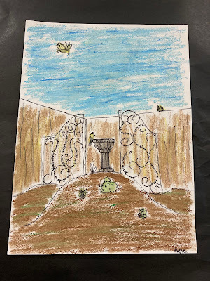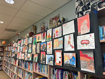 It is deeply surreal to walk into a school library hundreds of miles from my home and see an accurate rendering of my backyard. Notice how this artist used quotes from the book as the melted iron bars in the gate. I wish I'd thought of that.