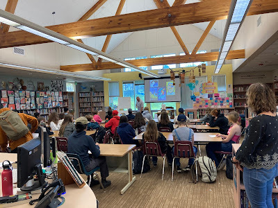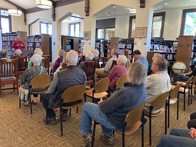 Sunday's community lecture in the library's great room, attended by 50 or so. Librarians Rachael and Mo were great and helpful hosts. I'm wearing my red shirt so you know I'm serious.