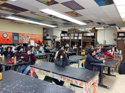 I can't describe how strongly an hour in teacher Matthew Gerlick's art class flashed me back to high school and college. I was not prepared. Paint splattered everywhere, half-finished projects clipped to drawing boards and drying in flat files, bins of supplies stacked to the ceiling. I felt at home in a way I haven't in decades. Some interesting young writers and artists, too.