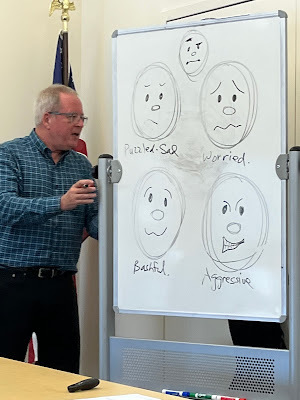 Saturday morning I did a writing workshop for a small but motivated group. This is an exercise where I draw an oval with two eyes and a nose, then have brave volunteers come up to add eyebrows, mouths, etc. and ascribe an emotion to the expression they created. The idea is to show the tremendous variety of complex and subtle emotions that can be conveyed with the simplest of graphics. Photo by Bonnie Withers (thanks Bonnie).